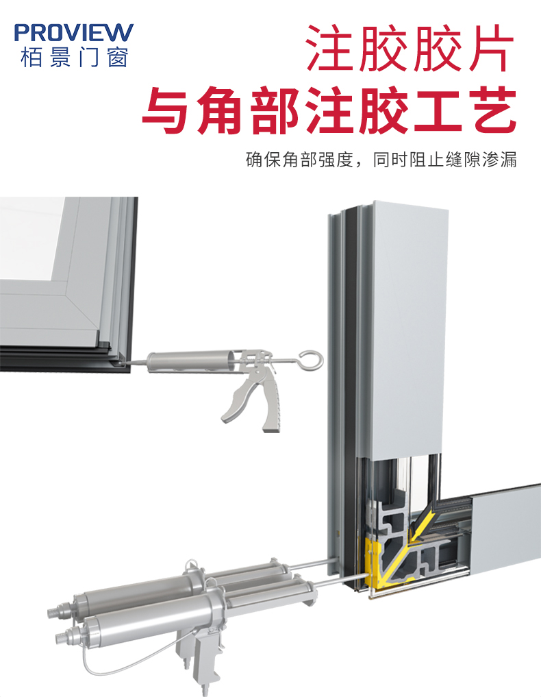 組角注膠工藝,配合導(dǎo)流板大幅增強(qiáng)角部強(qiáng)度,組角縫隙達(dá)到微米級標(biāo)準(zhǔn)。導(dǎo)流通道的設(shè)計保證了窗體角部的水密性能。